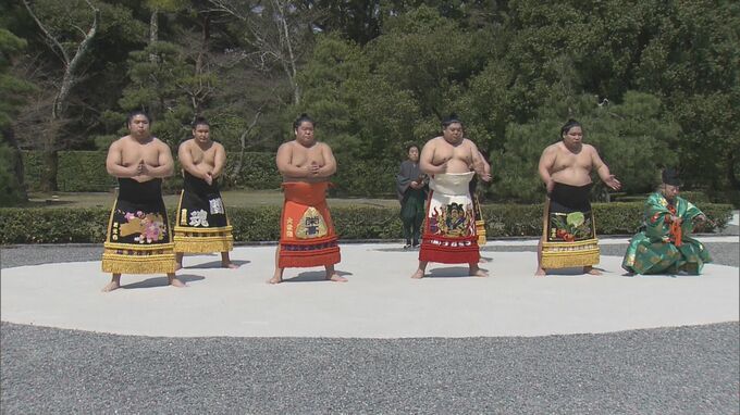 午前から行われた伊勢地方の春の風物詩、「神宮奉納大相撲」。「神宮奉納大相撲」は、春の地方巡業を前に巡業の成功と力士たちの無病息災を願い伊勢神宮への参拝と相撲の奉納を行います。内宮では横綱「照ノ富士」が力強く土俵入りを奉納。大勢の相撲ファンから歓声がわきました。