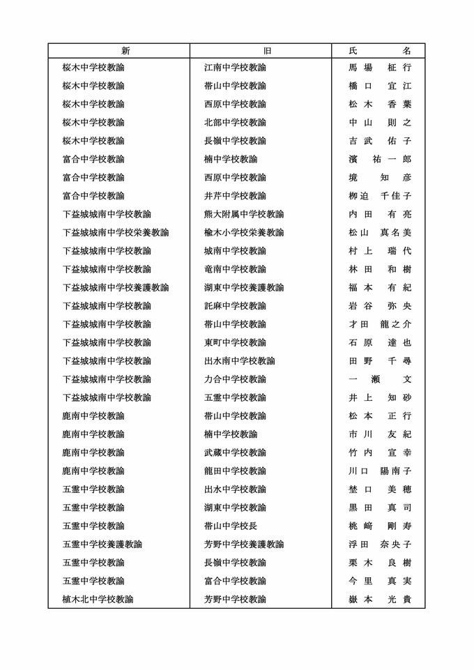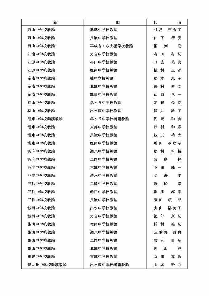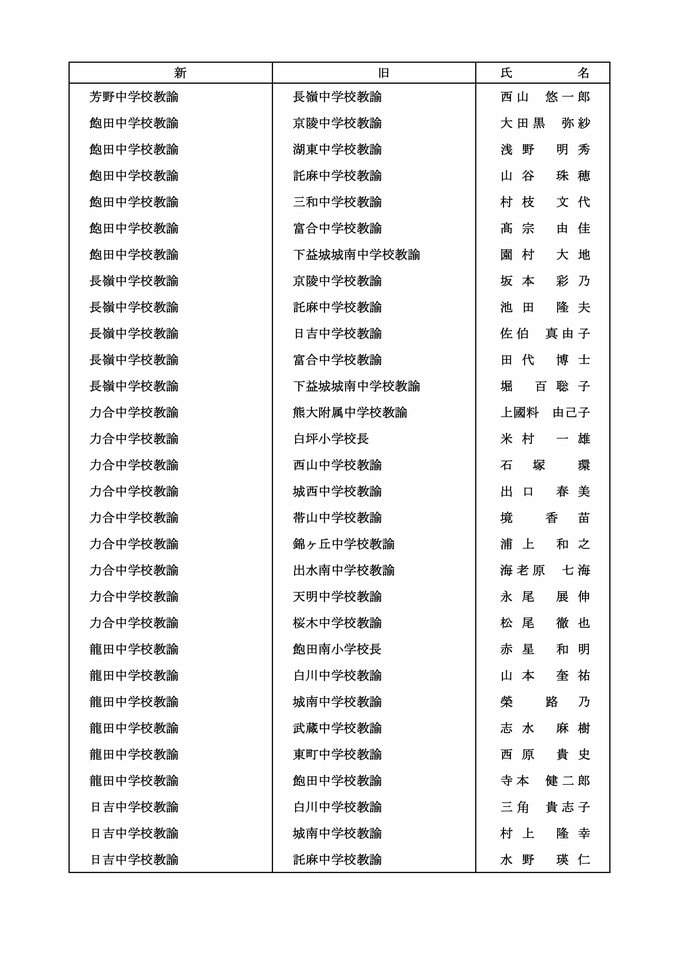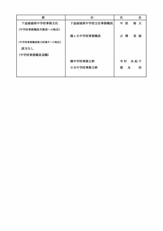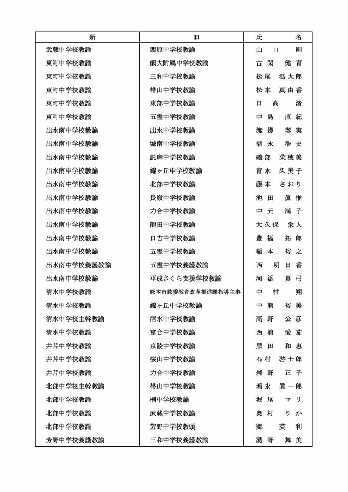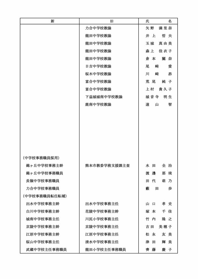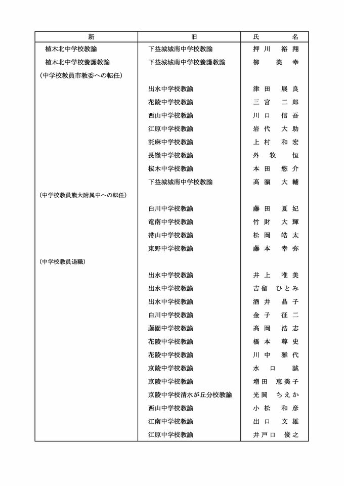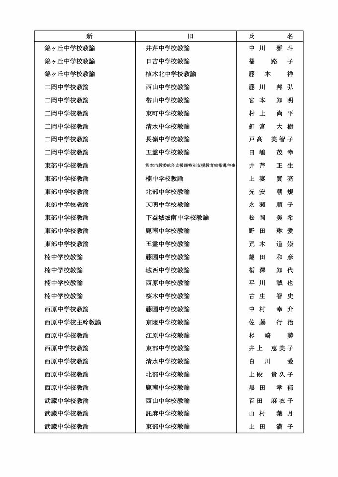 【中学校教員転任転補】【中学校教員市教委への転任】【中学校教員熊大附属中への転任】【中学校教員退職】