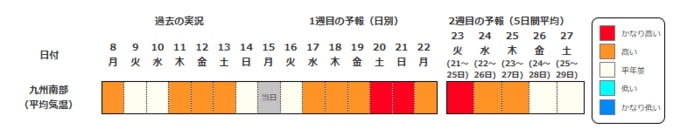 九州南部・奄美地方の向こう2週間の気温は、寒気の影響が弱く、暖かい空気が流れ込む日もあるため高い日が多く、20日頃からはかなり高くなる見込みです。農作物の管理等に注意してください。また、今後の気象情報等に留意してください。