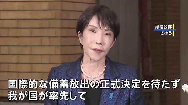 高市総理は11日、石油備蓄について今月16日にも放出を始め、合わせて254日分あるうち、まずは民間備蓄から15日分、国家備蓄から1か月分を放出すると明らかにしました。