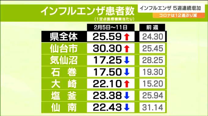 宮城県によりますと、2月11日までの1週間に県内91の定点医療機関でインフルエンザと診断された人は、前の週より118人多い2329人で5週連続で増加しました。1医療機関あたりでは25.59人と警報継続の基準となる10人を超えていて、県は引き続き全域に警報を出しています。