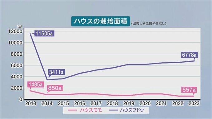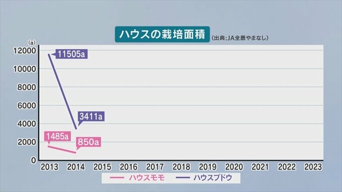 JA全農やまなしによりますと、大雪災害があった2014年の県内のハウス栽培面積は前の年と比べ、ブドウは3割にモモは5割まで減少しました。