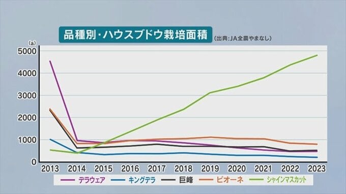 ハウスブドウの品種別では植え替えが進み、シャインマスカットの栽培面積が大雪前の約12倍となっています。