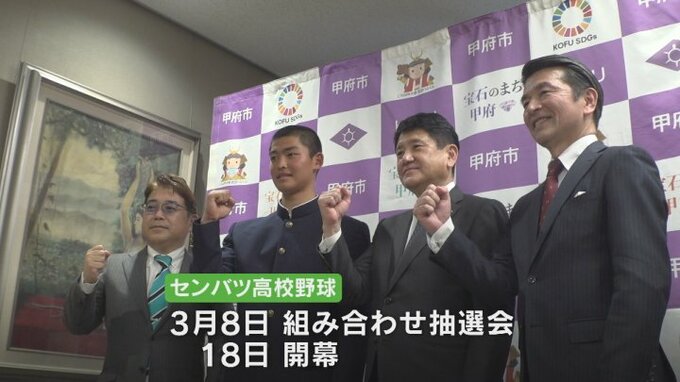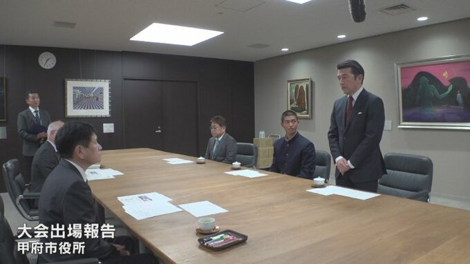 15日は野球部の監督とキャプテン、それに校長が甲府市役所を訪れ、樋口市長にセンバツ出場を報告し、中原義虎キャプテンが大会への決意を述べました。