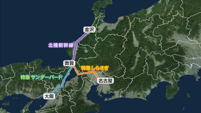 現在、金沢駅まで運行している名古屋・大阪方面からの特急の「しらさぎ」と「サンダーバード」は乗換なしですが、3月16日からは名古屋・大阪方面からは福井県の敦賀駅で北陸新幹線に乗り換える必要があるのです。