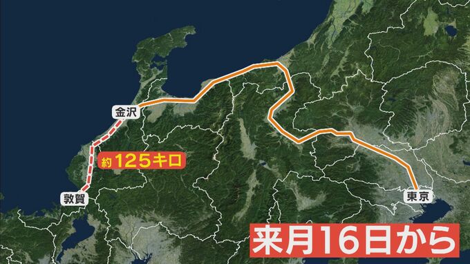 現在、東京駅と金沢駅の間を運行していますが、3月16日からは金沢駅から福井県の敦賀駅まで約125キロ、営業区間が延びます。