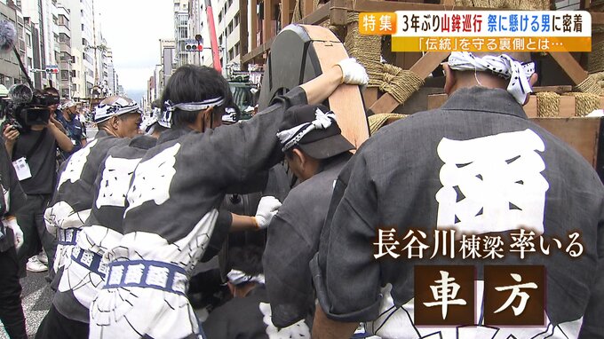 そして7月12日、最後に登場したのが長谷川棟梁率いる車方です。大きな車輪を取り付けて鉾が完成。総勢14人の車方、顔を合わせるのは実はこの日が初めてです。というのも、巡行前の練習は鉾の試し曳きをする「曳き初め」の1回だけなのです。