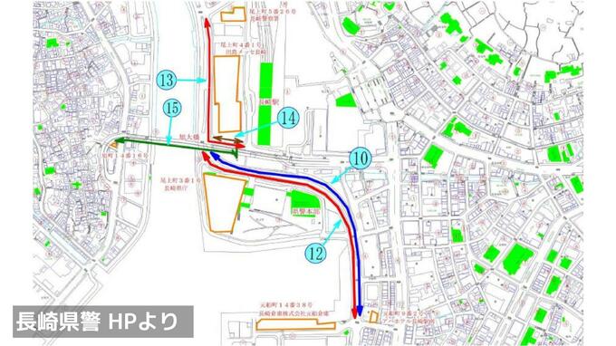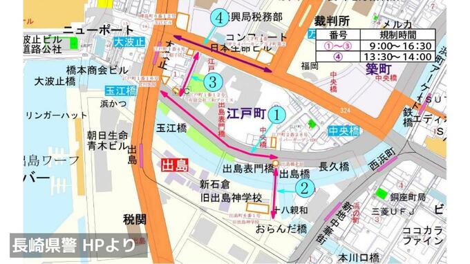 交通規制は、午前9時から午後5時頃まで、出島表門付近から出島メッセ付近で実施されます。