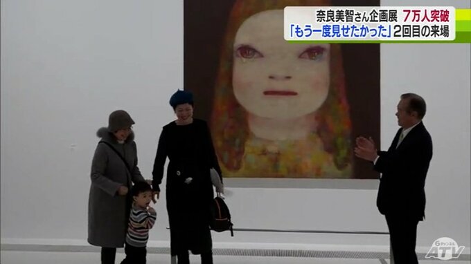 青森県立美術館で開かれている現代美術家・奈良美智(なら・よしとも)さんの企画展の入場者が7万人に突破し記念セレモニーが行われました7万人目の入場者となったのは、岩手県から訪れた氏家真梨子さんと息子の大…