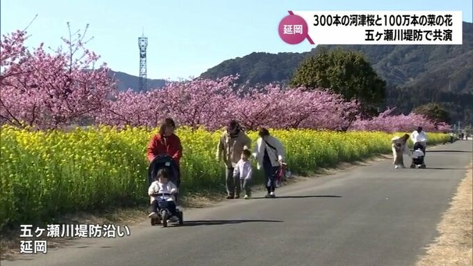 宮崎県延岡市では、五ヶ瀬川の堤防に沿って咲いている河津桜と菜の花の共演が訪れた人たちを楽しませています。延岡市の五ヶ瀬川堤防沿いの桜の名所「コノハナロード」では、およそ1キロにわたって300本の河津桜と1…