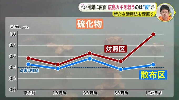その結果、改善とまでは行かないまでも、ほかのエリアでは増加している硫化物がカキ殻をまいたエリアでは「増加しない」という成果を確認しています。