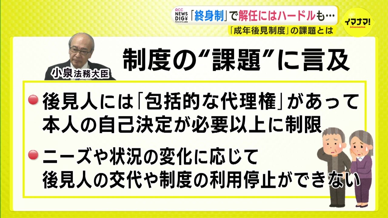 成年後見制度について小泉法務大臣は、13日の会見で▽後見人には「包括的な代理権」があって本人の自己決定が必要以上に制限される、▽ニーズや状況の変化に応じて後見人を交代させたり、制度の利用をやめたりすることができないといった課題に触れています。