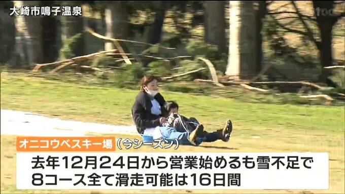 大崎市鳴子温泉のオニコウベスキー場は去年12月24日から営業を始めましたが雪不足に悩まされ、8コース全てで滑走できたのは16日間に留まります。