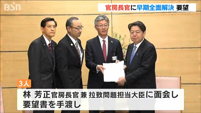 要望書では、いまだ帰国を果たせていない拉致問題の早期全面解決を図ることや帰国した被害者への支援継続などを求めました。