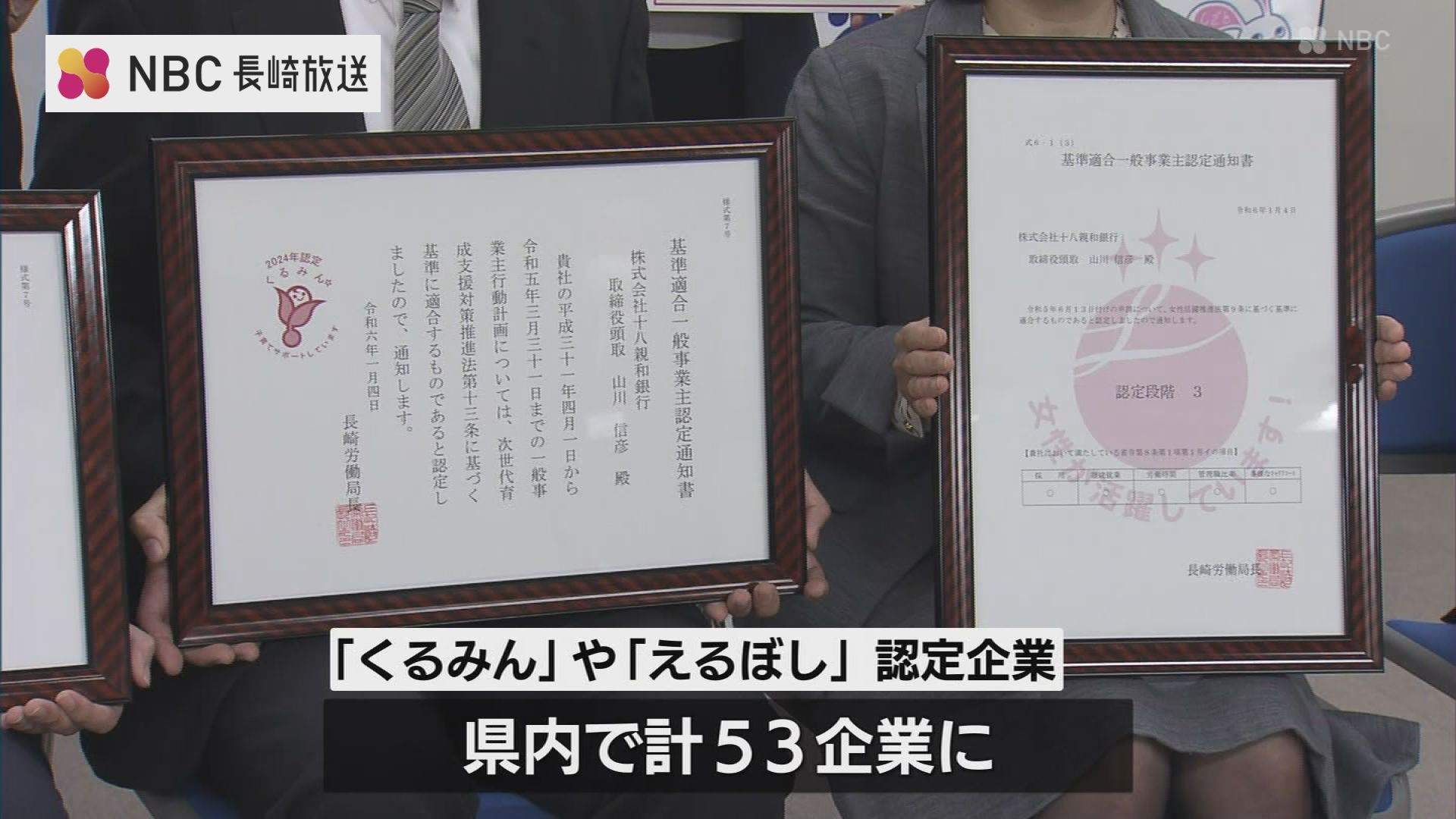 県内で「くるみん」や「えるぼし」に認定されている企業の数は合わせて53となり、長崎労働局では今後もさらなる拡大に取り組みたいとしています。