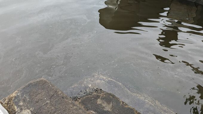 けさ(19日)岡山市南区の岡山港で、岸壁に停泊していたタンカーから重油が海に流出しました。海上に約200メートルに渡って広がりましたが、現在のところ目立った被害は確認されていません。