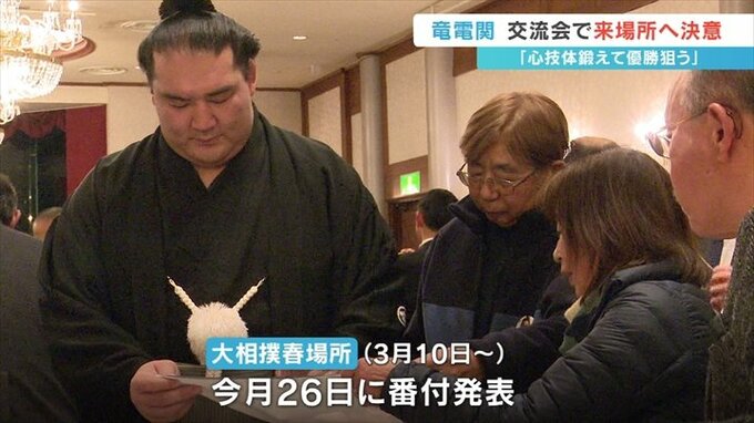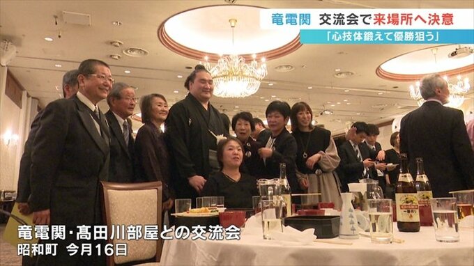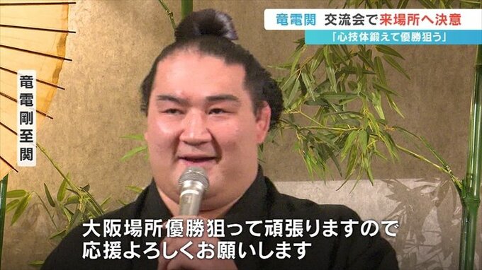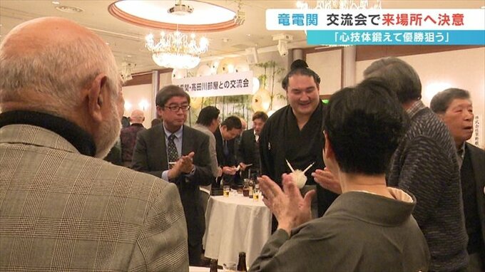 先場所で大きく負け越した甲府市出身の竜電が、3月の春場所は優勝目指して頑張ると高田川部屋との交流会で語りました。