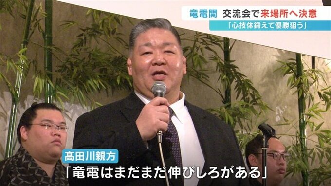 会場では高田川親方が日頃の応援への感謝を述べ、竜電について「まだまだ伸びしろがある」と来場所への期待感を話しました。