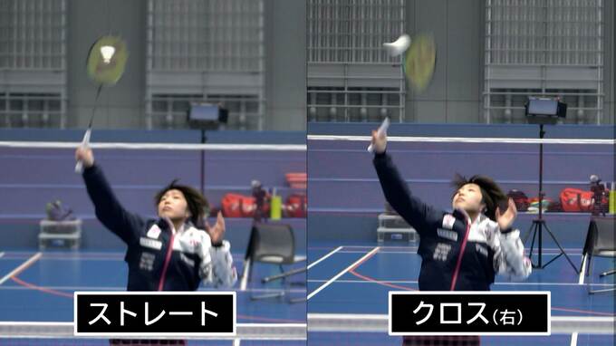 対戦相手はシャトルがラケットに当たるギリギリまでコースが予測出来ないため、一瞬、足が止まってしまう場面が山口選手の試合では見られる。実際のショットを披露して貰うと、同じ振り方に見えるショットが正面とクロスに打ち分けられた。