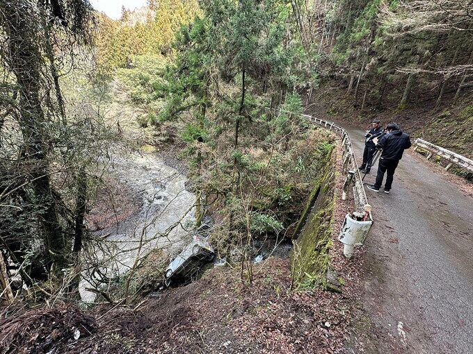 現場は山あいで川沿いを走る細い道路で、警察は車が転落したいきさつなどを詳しく調べています。