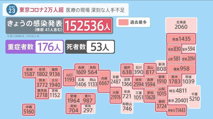 全国では15万人2536人の感染を発表。大阪で2万人超え、愛知、神奈川でも1万人を超えるなど30の自治体で過去最多を更新しています。