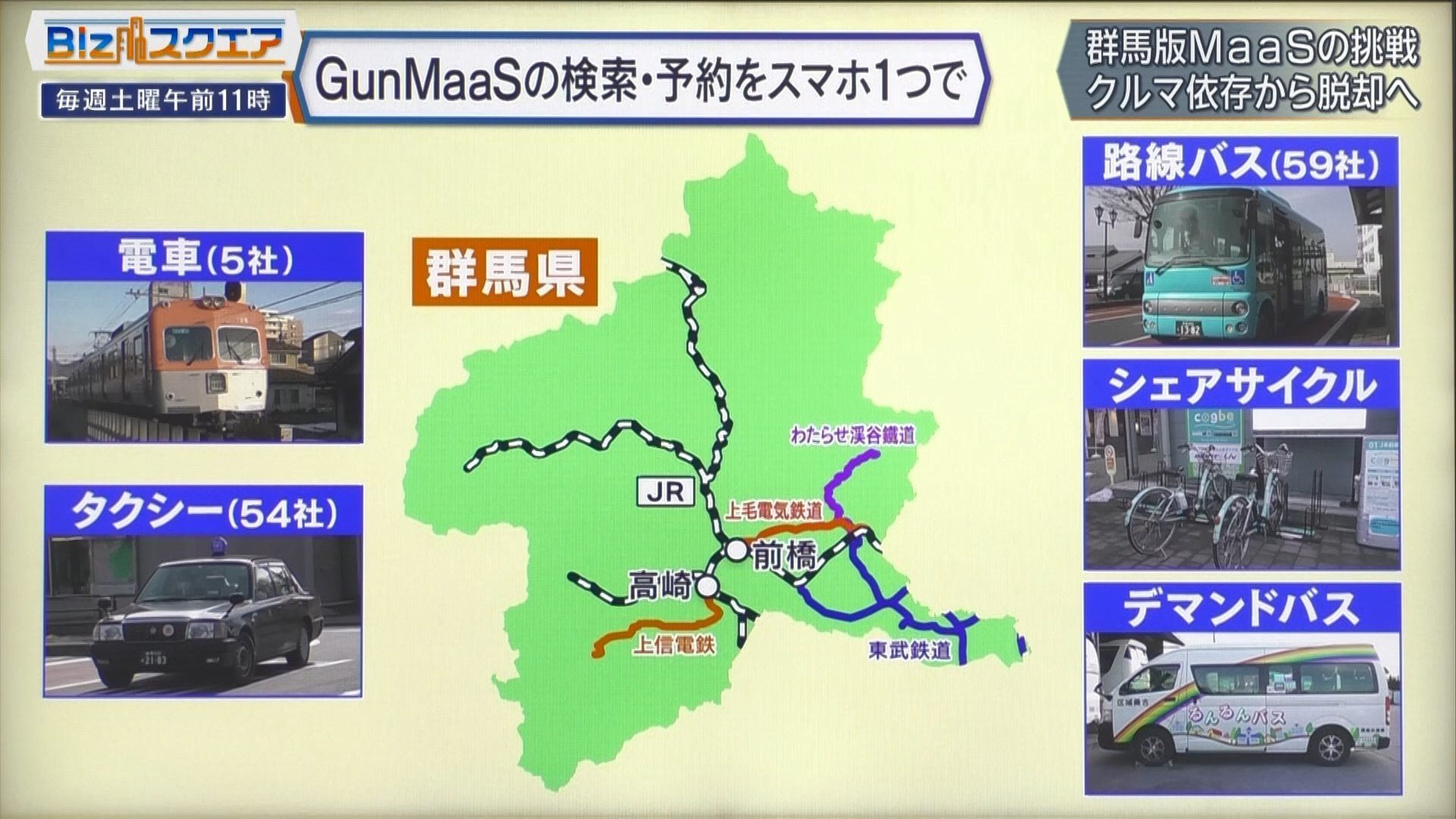GunMaaSは元々、前橋市で行っていた「MaeMaaS」を群馬県全域に拡大したもの。現在は電車や路線バス、タクシーの他、前橋市ではデマンドバスやシェアサイクルなども一括して検索、そして予約もできるという便利なシステム。