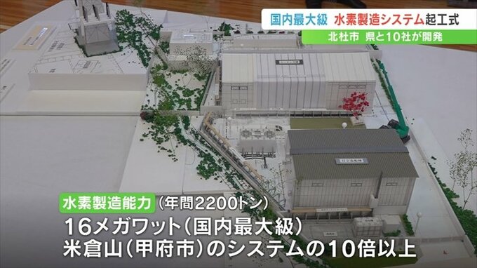 システムは水の電気分解から水素を作るもので、北杜市白州町のサントリー白州工場の隣の県有地3000平方メートルに建設され、2025年に稼働する予定です。