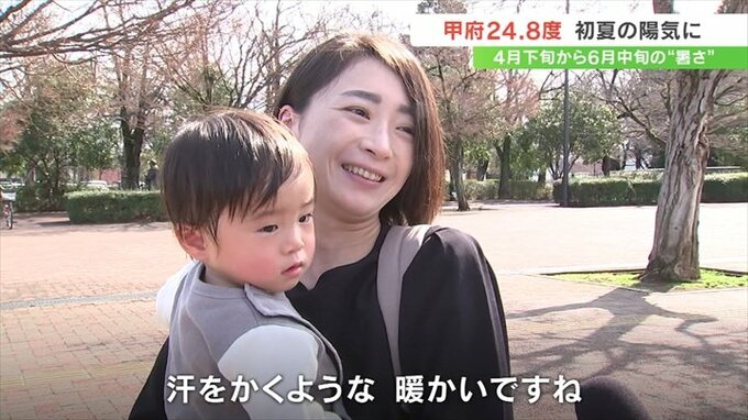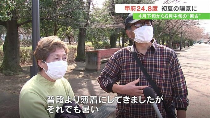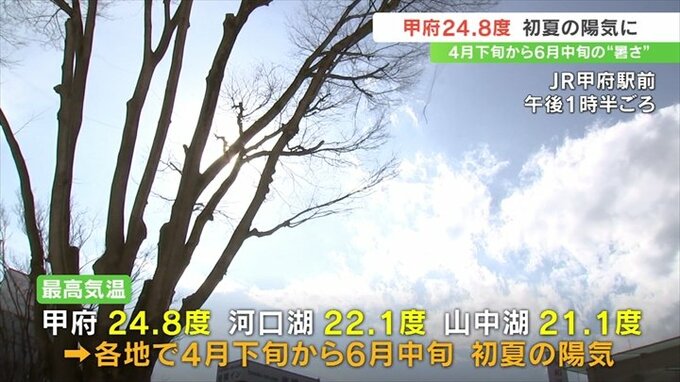 最高気温は甲府が24.8℃、河口湖が22.1℃などと観測10地点すべてで2024年最も高くなり、各地で4月下旬から6月中旬の初夏の陽気となりました。