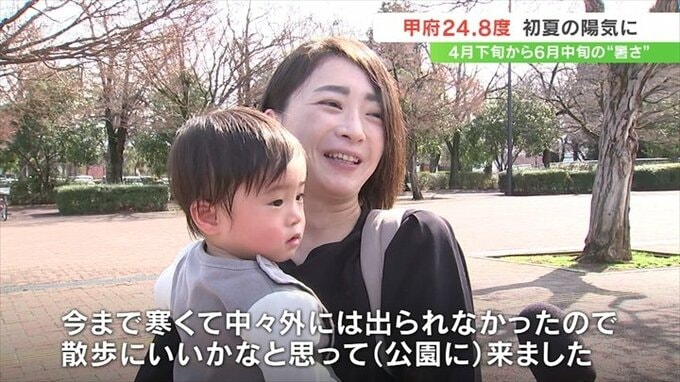 「今まで寒くて中々外には出られなかったので、散歩にいいかなと思って(公園に)来ました。汗をかくような、暖かいですね」