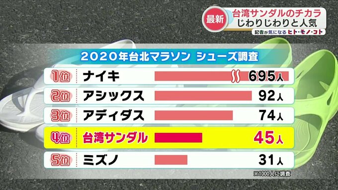 阿部さん「2020年の台北マラソンのシューズ調査というのがありまして、上からNIKE、adidas、Asicsと4番目が台湾サンダルというぐらいの普及率」