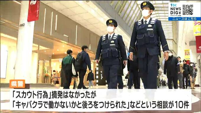 県警によりますと去年、「スカウト行為」での摘発はありませんでしたが、「街を歩いていたらキャバクラで働かないかと後ろをつけられた」などという相談が10件あったということです。
