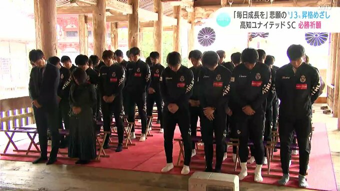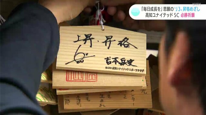 高知ユナイテッドは去年、天皇杯で2度J1クラブを破る快進撃を見せたほか、JFLでは終盤までJ3昇格が狙える位置で戦い、過去最高の7位でシーズンを終えました。悲願のJ3昇格に向けて、20日は、吉本監督や今シーズンキャプテンに就任した小林大智(こばやし・だいち)選手らが玉串を捧げ、さらなる飛躍を誓いました。必勝祈願の後は、選手1人1人が絵馬を奉納しました。