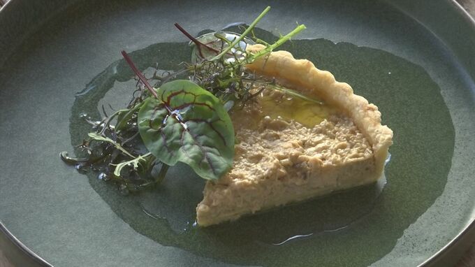 仕上げにオリーブオイルをかけて「鳥取ウニムースとエビのキッシュ」の出来上がりです。