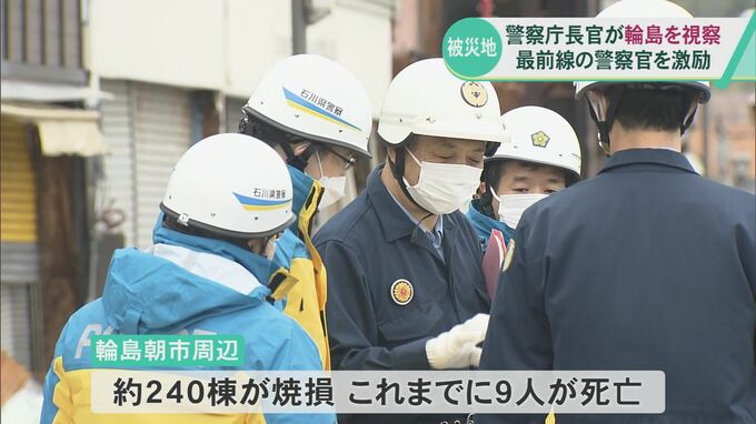この後、露木長官は、大規模な火災が発生した輪島市中心部の輪島朝市周辺を訪れ、被害状況を確認しました。輪島朝市周辺では、地震後に発生した火災でおよそ240棟が焼け、これまでに9人の死亡が確認されています。