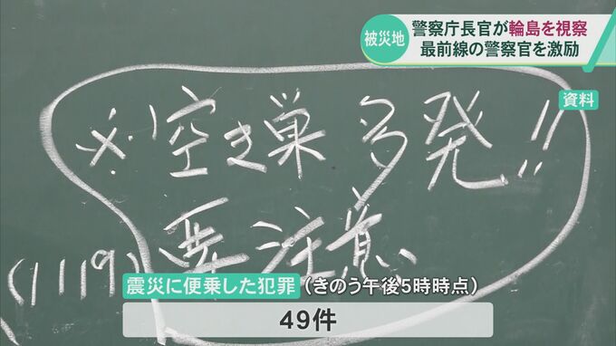 震災後、被災地では空き巣や置き引きなどの犯罪が相次いで確認されています。警察庁の露木康浩長官は20日、石川県輪島市を訪れ最前線で活動する警察官を激励したほか現地の防犯対策などを視察しました。