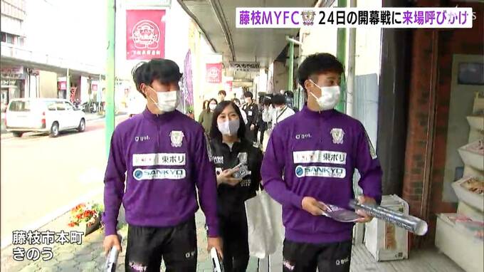 藤枝MYFCは2月24日のホーム開幕戦で来場者1万人を目指していて、1人でも多くの人にスタジアムに来てもらおうと選手とスタッフが地元で広報活動を行いました。