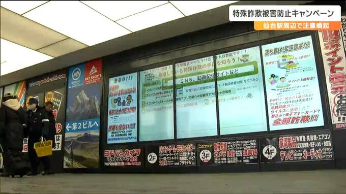 JR仙台駅東口では、警察官らおよそ20人が通行人にチラシなどを配りながら、特殊詐欺の被害に遭わないよう注意を呼びかけました。また、仙台駅東口の大型ビジョンやバスターミナルの柱巻き広告では、特殊詐欺のさまざまな手口や対策を紹介する映像も流されています。