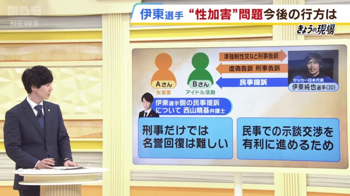 かたや伊東選手側の虚偽告訴についても、結論としてやっぱり刑事処罰を科すまでは難しいというところで、具体的な内容がわからないまま不起訴になってしまうという可能性もあって、そうすると事実として何があったのか世の中がわからなくなってしまうため、民事の裁判で事実を改めて認定してもらうために、名誉回復を考えて裁判を起こしたってことが考えられます。