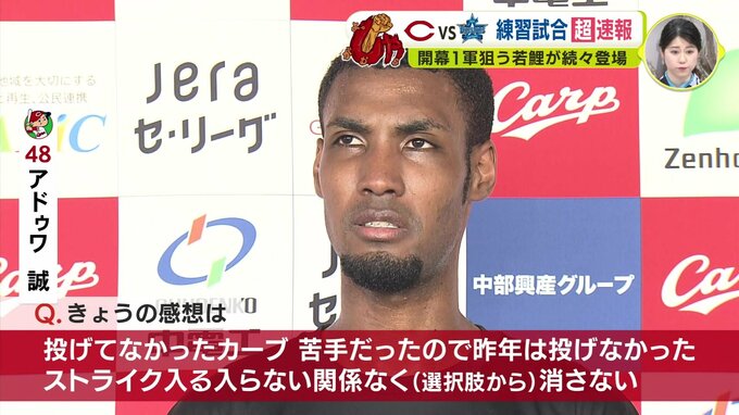 練習試合の先発は、プロ8年目、25歳の アドゥワ誠。その立ち上がり、DeNA先頭のドラフト1位・度会隆輝 をセカンドゴロに仕留めます。2アウト・1塁で迎えたのは、アドゥワと同年代にあたる4番・牧秀悟 。インサイドのストレートで見逃しの三振を奪い、無失点のスタートを切ります。