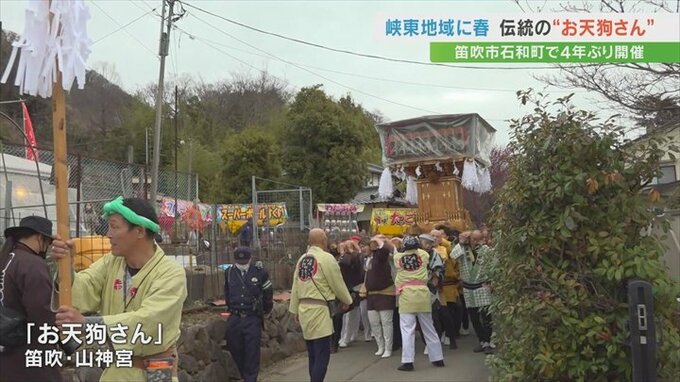 山梨県の峡東地域に春の訪れを告げる伝統の山神宮の「お天狗さん」が、笛吹市で4年ぶりに行われました。