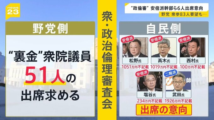 野党側は“裏金”問題に関わった衆院議員51人全員の出席を求めていましたが、これまでに出席の意向を示しているのは安倍派の事務総長経験者など5人です。