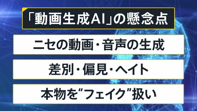 「動画生成AI」の懸念点として考えられる、「ニセの動画・音声の生成」「差別・偏見・ヘイト」「本物を“フェイク”扱い」などについて、どう対応すべきなのか?