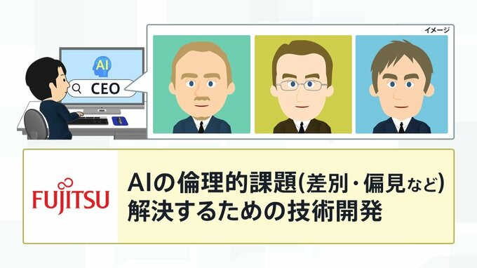「差別や偏見」などの点については、例えば画像生成AIにCEO=最高経営責任者と指示を出すと、白人の男性ばかりが出てきてしまうということがある。こうしたAIの倫理的な課題を解決するために、日本国内では富士通がAIの倫理的課題(差別・偏見など)を解決するための技術開発に取り組んでいます。