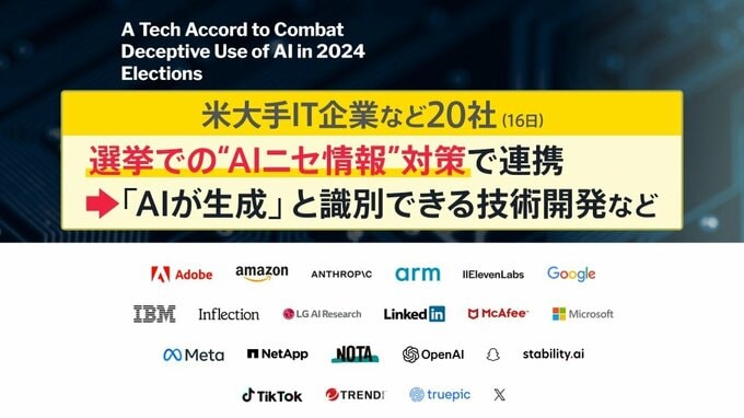 まずは、「ニセの動画・音声の生成」などについて。アメリカのIT大手など20社が16日に、24年世界各地で行われる選挙に悪影響を及ぼさないように連携して取り組む協定を結びました。「AIが生成」と識別できる技術開発などを進めていこうとしてるわけです。