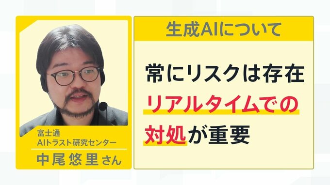 ただ、富士通AIトラスト研究センターの中村悠里さんによると、生成AIについては「常にリスクが存在し、リアルタイムでの対処が重要」とのことです。