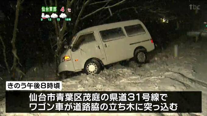 このうち、21日午後8時頃には仙台市青葉区茂庭の県道31号線で、ワゴン車がスリップして道路脇の立ち木に突っ込みました。この事故でけがをした人はいませんでした。