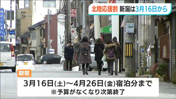 4月26日分の宿泊まで適応されますが、予算が無くなり次第終了です。新潟県の分の予算は25億7000万円余りでおよそ30万人の宿泊を見込んでいるということです。