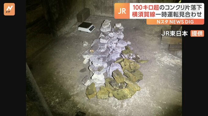 きょう、JR横須賀線のトンネルにあわせて100キロ超える重さのコンクリート片が落ちているのが見つかり、一部区間で始発から運転を見合わせました。JR東日本によりますと、午前3時過ぎに横須賀線の品川~新橋間のト…