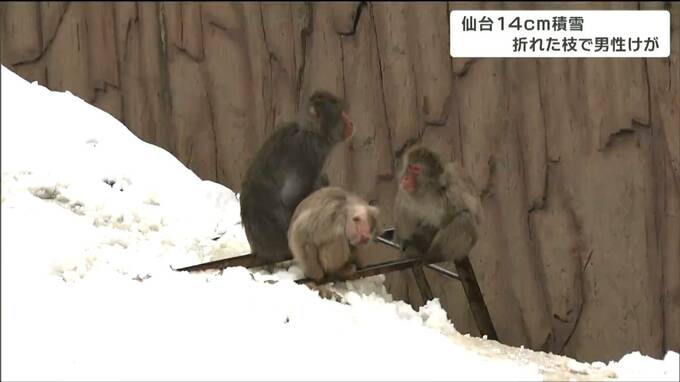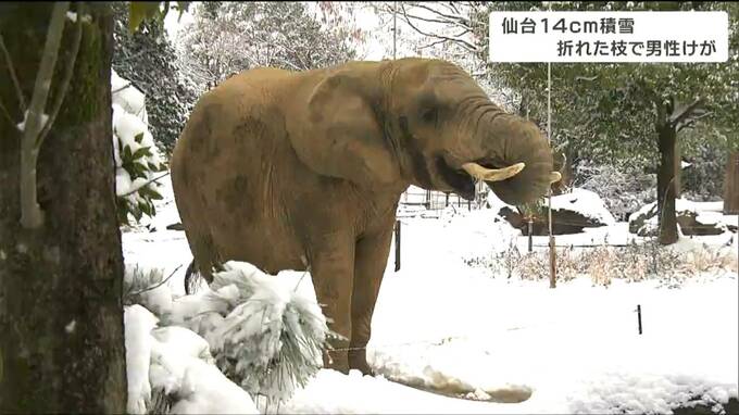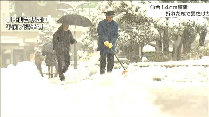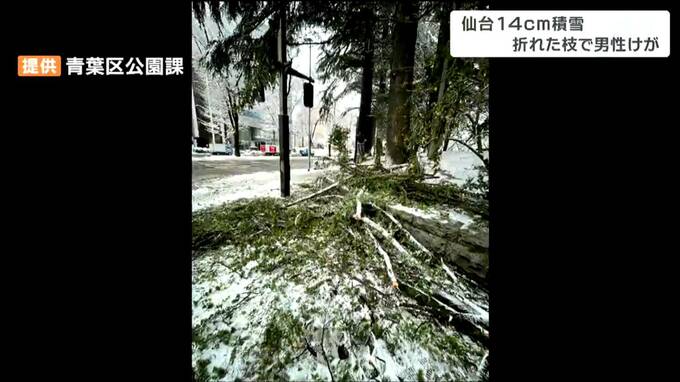宮城県内は、前線や寒気の影響で、各地で雪が降り積もり今シーズン最も積もった所もあります。仙台では、雪の重みで樹木の枝が折れ男性がけがをしました。