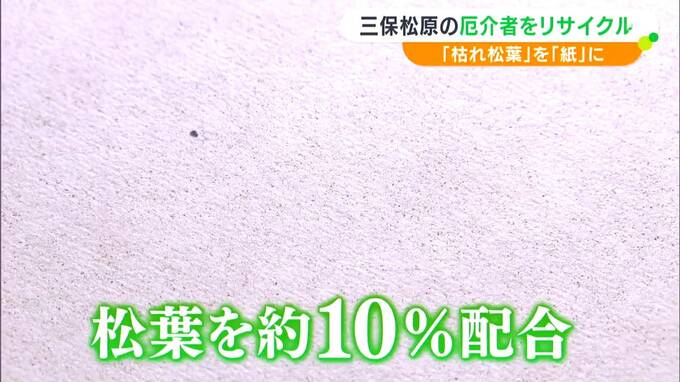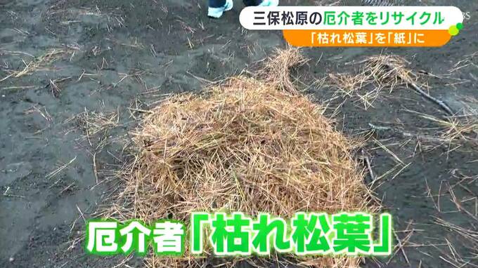 集めた枯れ松葉を有効活用しようと、地元の企業などでつくる団体が「枯れ松葉」を「紙」にリサイクルして商品化する取り組みがスタートしました。